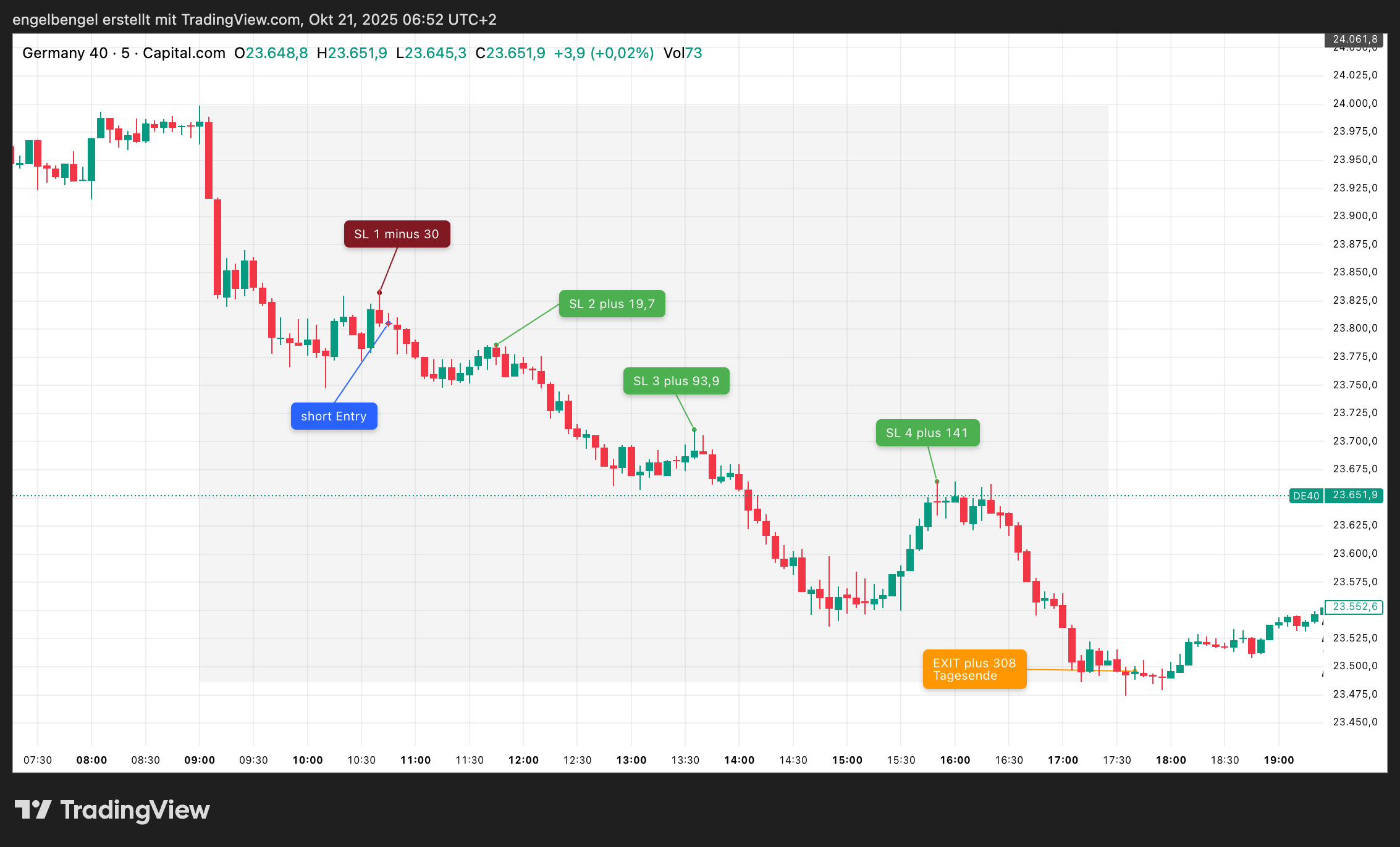 Strategietest „Umkehrstab“, DAX, 5 min, Freitag 23.01.2026